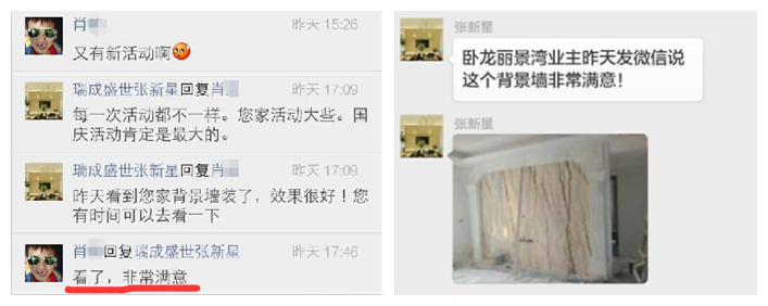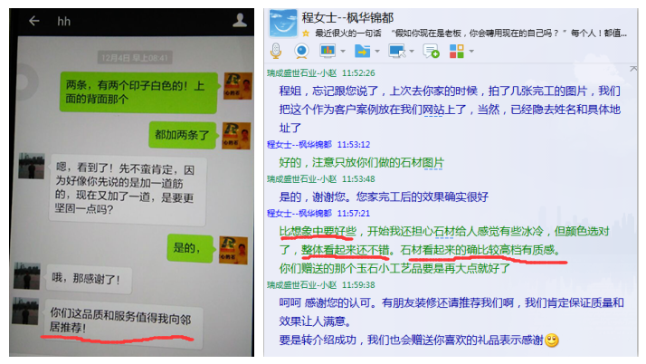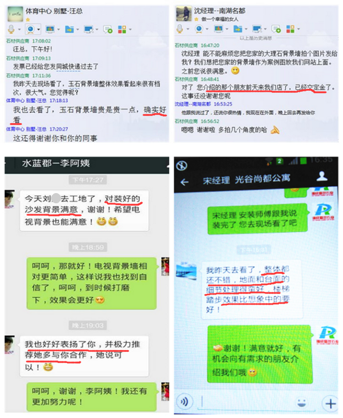 瑞成石业已经为湖北6000多户业主提供家装服务,收到好评如潮。有一些顾客是在电话回访时表示很满意。下面是一部分顾客通过文字聊天形式对我们的评价: