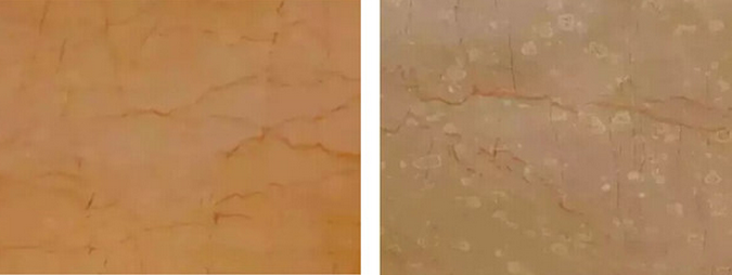 从材料来比较,我们的石材材料全部都是级别很高的特级或A级产品,都是质量很高的等级。大理石根据其品相可分为:特级和A、B、C以及其他级别,其品相则逐级递减。品相越纯,出产率越低,而价格也会相应更高。下面两块“帝王金”分别就是A级和C级。